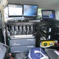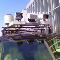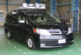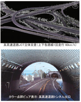 GPS/IMU複合による車両の位置/姿勢計算と、搭載したセンサで計測したレーザデータ/カメラ画像により、車体動揺や路面傾斜によらず正確な道路地物の三次元位置計測を可能にする、高精度移動式三次元計測システムです。従来の現地測量ではなく、車載したレーザースキャナで計測を行うため、交通量の多い道路でも短時間にデータ取得がおこなえます。