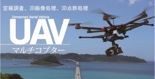 UAV(Unmanned Aerial Vehicle)とは、マルチコプター等を無人で飛行させる無人航空機のことです。弊社はこれを利用することで、航空写真の撮影や空からの視点での測量・調査を行います。